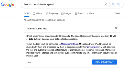 A simple Google search including the words “how to check internet speed” will bring up an in-feed internet speed tester. Simply click “Run Speed Test”.