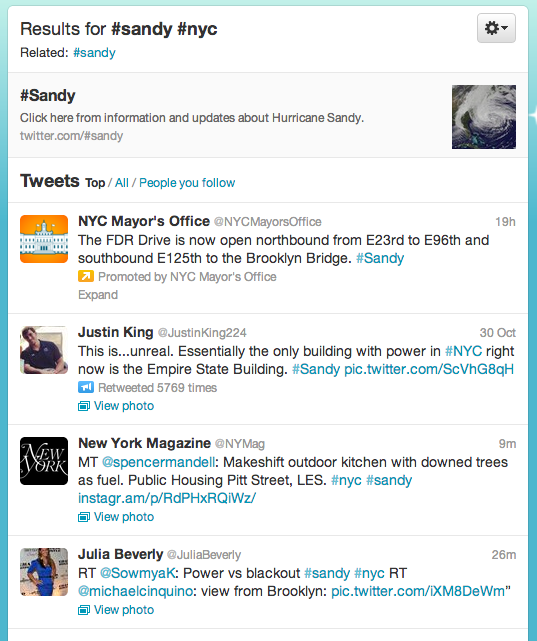 When my NYC building was blacked out during Sandy, a friend was following the Twitter